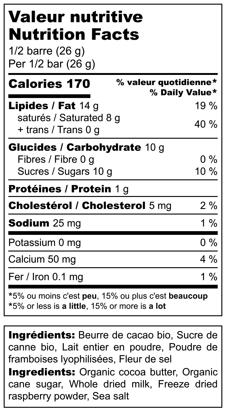 Cette petite gâterie à base de beurre de cacao vénézuélien (47,5%) fond suavement en bouche laissant s’exprimer tout le fruité provenant de l’ajout de framboises québécoises lyophilisées. Un mariage Venezuela/Québec surprenant avec un taux de sucre total (incluant le lactose du lait) d’à peine 39%